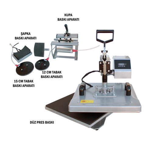 Kupa presi, 2 boy tabak aparatı, 38x38cm düz pres, şapka pres fonksiyonel başlıkları ile tüm transfer baskı işlerinizi yapabileceğiniz kaliteli baskı presidir.