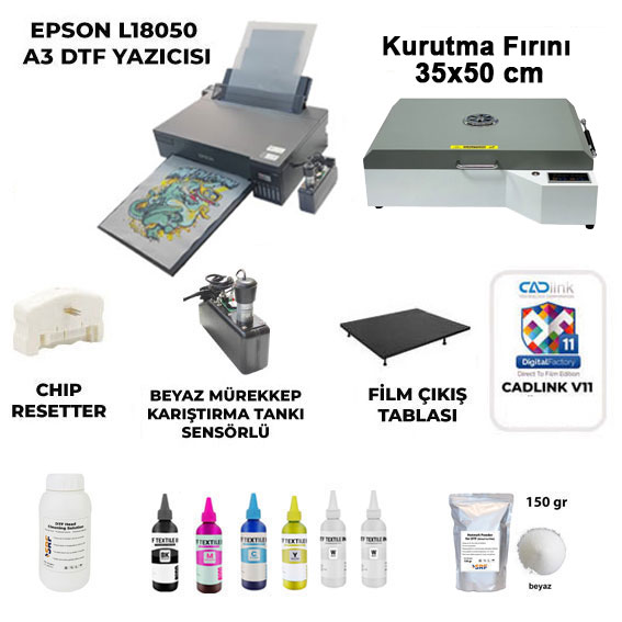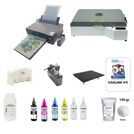 1 adet L805 ya da L18050 Epson yazıcı (DTF baskı için tarafımızca modifiye edilmiştir.)DTF Mürekkep Seti (Sarı , Kırmızı , Mavi , Siyah ve Beyaz)1 adet Beyaz Mürekkep Karıştırıcı ve Sirkülasyon Pompası1 adet Rip Programı (Cadlink )DTF A4/A3 Pet Transfer FilmiDTF Transfer Baskı TozuDüz Transfer baskı makinaları (38x38cm, 40x50cm) ya da DTF Film kurutma fırınıHem kurulum aşaması hem de satış sonrası teknik destek hizmetlerini tarafımızca alacağınız bu yeni baskı sistemi sizler için satışa sunulmuştur.