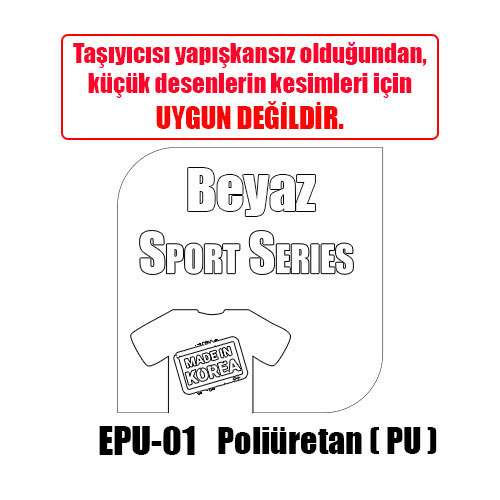 Önemli Not: Taşıyıcı film yapışkansızdır. Taşıyıcının yapışkansız olması nedeniyle spor formalarındaki isim ve numara basloşaro gibi büyük desenler kesildiğinde çok kolay ayıklanır. Daha küçük desenler için yaşıyıcısı yapışkanlı olan diğer PU serisi flexler kullanılmaktadır.