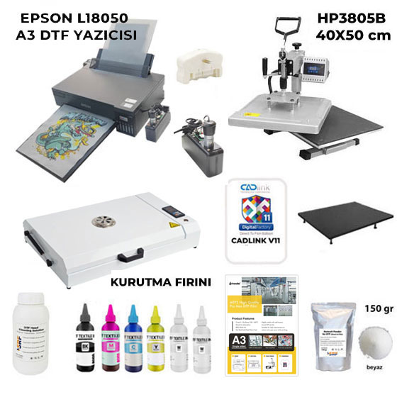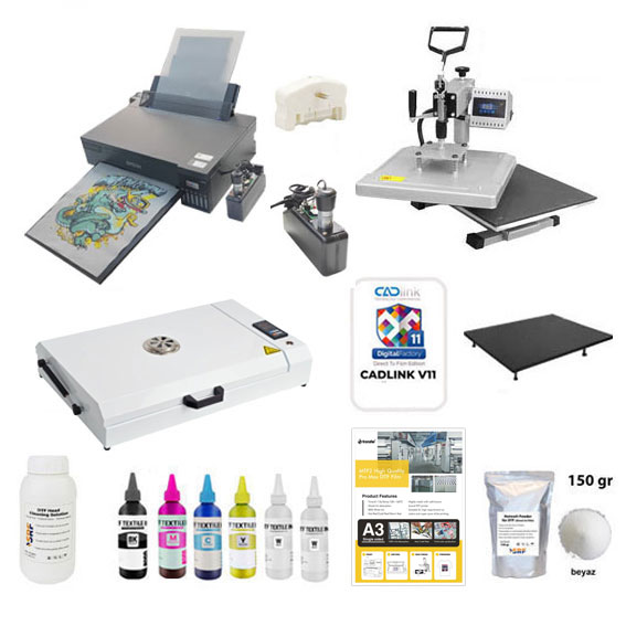 1 adet L805 ya da L18050 Epson yazıcı (DTF baskı için tarafımızca modifiye edilmiştir.)DTF Mürekkep Seti (Sarı , Kırmızı , Mavi , Siyah ve Beyaz)1 adet Beyaz Mürekkep Karıştırıcı ve Sirkülasyon Pompası1 adet Rip Programı (Cadlink )DTF A4/A3 Pet Transfer FilmiDTF Transfer Baskı TozuDüz Transfer baskı makinaları (38x38cm, 40x50cm) ya da DTF Film kurutma fırınıHem kurulum aşaması hem de satış sonrası teknik destek hizmetlerini tarafımızca alacağınız bu yeni baskı sistemi sizler için satışa sunulmuştur.