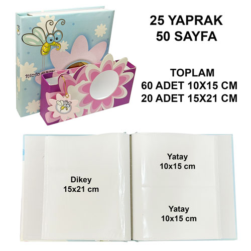 60 fotoğraflık alan 10x15 ölçülerinde, 30 fotoğraflık alan ise 15x21 ölçülerindeki fotoğraflarınız için tasarlanmıştır.