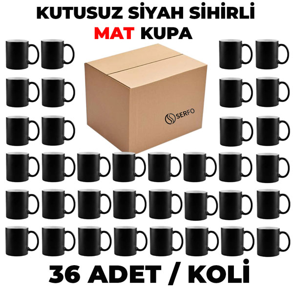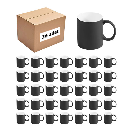 Sublimasyon Porselen MAT Siyah Sihirli Kupa - 36 adetSublimasyon ve laser baskıya uygun, üzeri özel kaplamalı ithal MAT siyah renkli porselen kupalardır. Renk değiştiren sihirli kupalar soğuk iken siyah görüntüsü olan ama içerisine sıcak sıvı konulduğunda rengi beyazlaşarak üzerindeki baskıyı gösteren bir üründür. Soğuduğunda tekrar siyah renge dönüşerek üzerindeki baskıyı gizler.* Ürün kutusuz olarak gönderilmektedir.