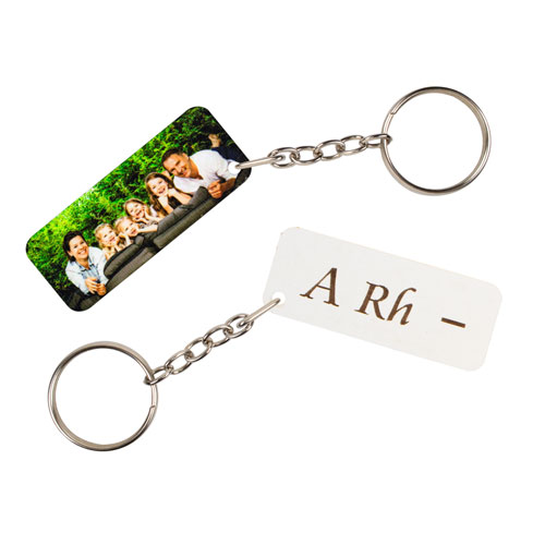 Anahtarlığın bir yüzeyi lazer makinesinde kazıma yöntemi kullanılarak A RH (-) kan grubu yazılmıştır.