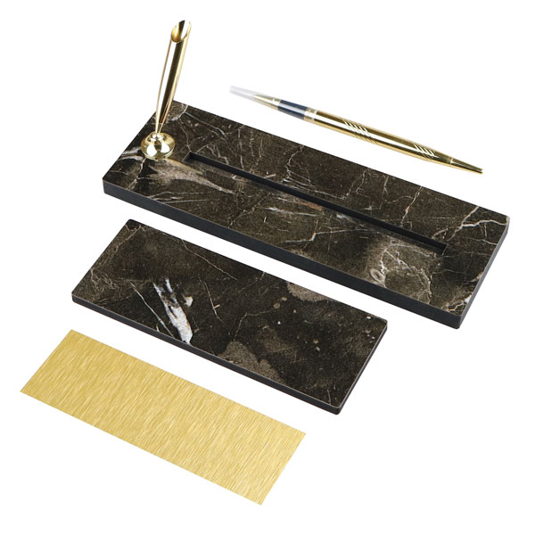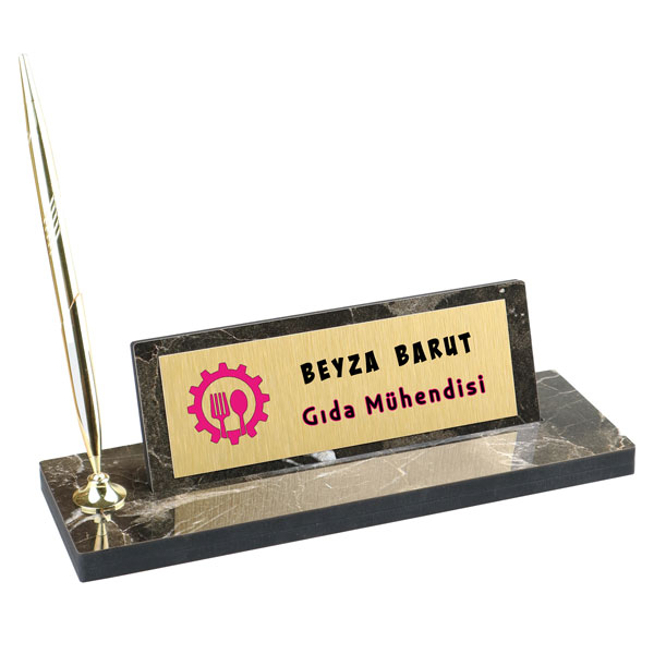Ürün içeriği: 1 adet mermer desenli ahşap isimlik + 1 adet altın renkli kalem + 1 adet altın renkli sublimasyon baskı metali