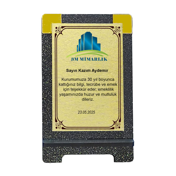 Ürün İçeriği: 1 Adet MDF Ahşap Ödül Plaketi 13x21  cm, 1 Adet Baskı Metali 10 x 15 cm, 1 Adet MDF Ayak 10 x 12,7 cm