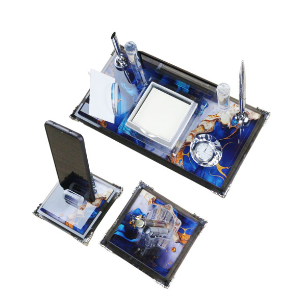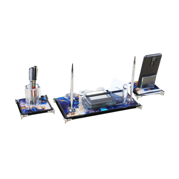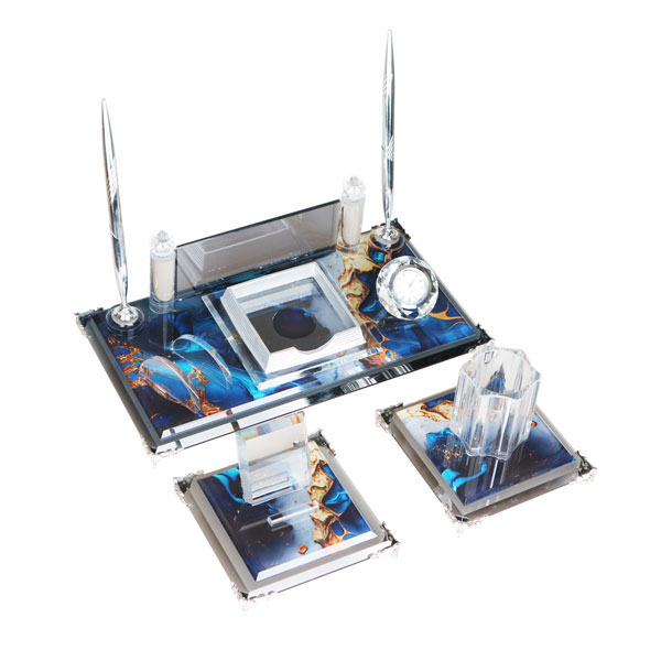 Şık tasarımı ve fonksiyonel yapısıyla öne çıkan Üçlü Kristal Masa İsimlik Seti, ofis masalarında düzeni ve prestiji bir arada sunar.