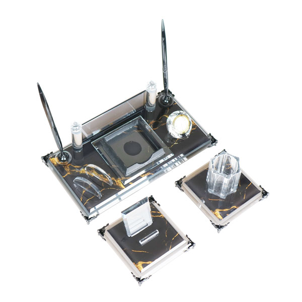 Şık tasarımı ve fonksiyonel yapısıyla öne çıkan Üçlü Kristal Masa İsimlik Seti, ofis masalarında düzeni ve prestiji bir arada sunar.