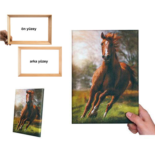 Ürün 18,5 cm x 27 cm ebatlarında ahşap bir çerçeve ile 26 cm x 35,5 cm ebatlarında sublimasyon baskıya uygun kanvas kumaştan ibarettir.