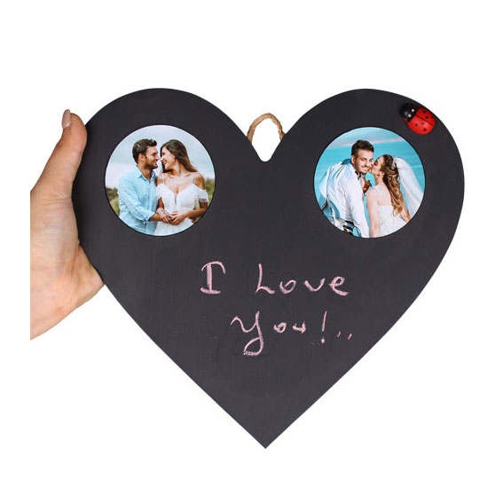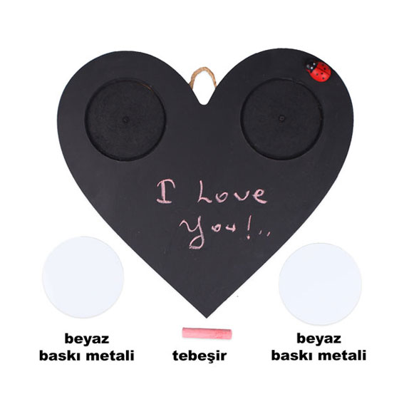 Ürün içeriği: 1 adet ahşap siyah kalp çerçeve, 2 adet yuvarlak beyaz baskı metali ve 1 adet tebeşir