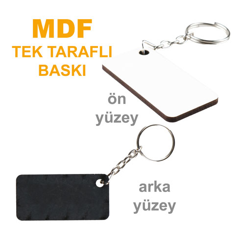 Sublimasyon baskıya uygun beyaz renk MDF den üretilmiş bir yüzüne baskı yapılabilen dikdörtgen şeklinde anahtarlıktır.