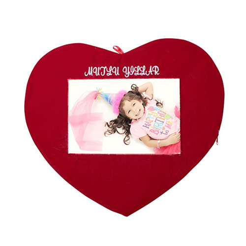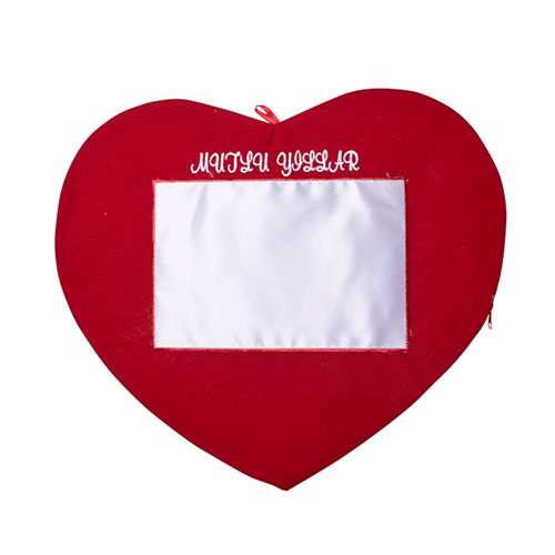Sublimasyon baskıya uygun, ''Mutlu Yıllar'' nakışlı, kırmızı renkli, kalp şeklinde ve yatay baskı alanına sahip olan bir yastık kılıfıdır.