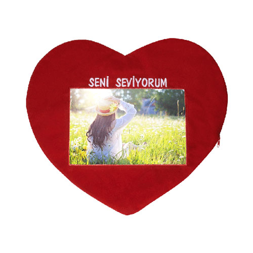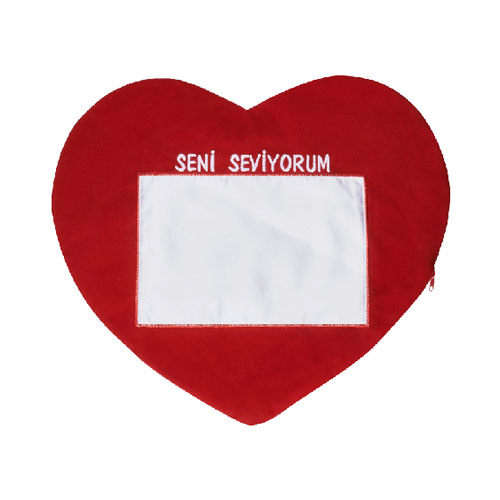 Sublimasyon ve lazer baskıya uygun, ''Seni Seviyorum'' nakışlı, kırmızı renkte, kalp şeklinde ve yatay baskı alanı sahip olan bir yastık kılıfıdır.