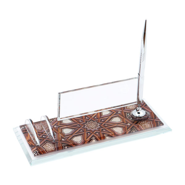 Üzerinde altın renkli özel bir metal plaka, gold renkli şık bir kalem ve kartvizit tutucu bulunur.