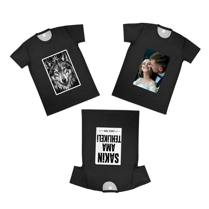 Sublimasyon baskıya uygun siyah unisex tişört modelimiz, ön yüzeyinde bulunan 19x29 cm beyaz baskı alanı sayesinde kişiye özel tasarımlar, promosyon ürünleri, kurumsal baskılar ve e-ticaret satışları için ideal bir çözümdür.