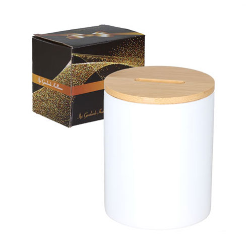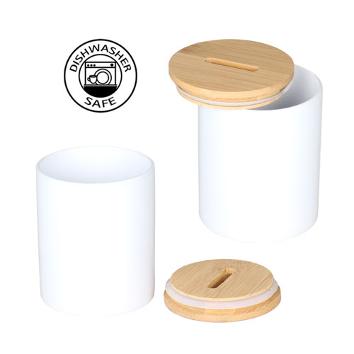 Sublimasyon ve lazer transfer baskıya uygun özel kaplamalı porselen bambu kumbara modeli. Ürün hediye kutusu ile beraber gelmektedir.