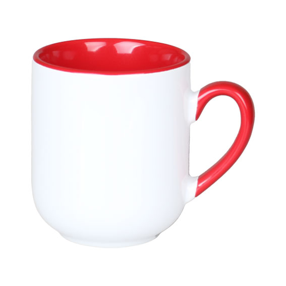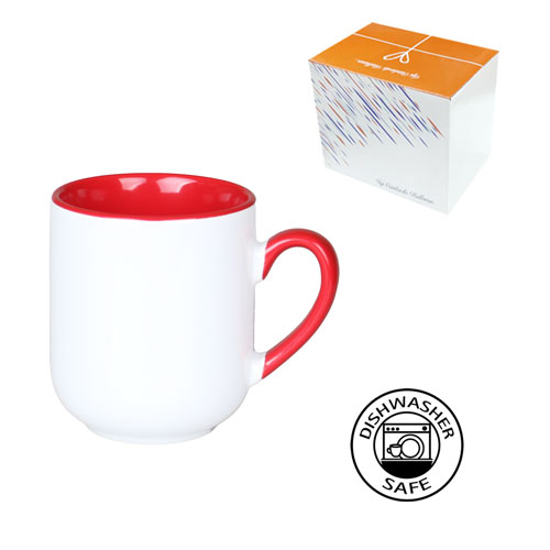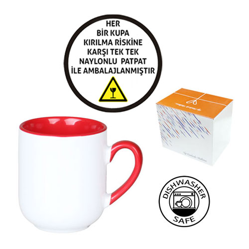 Sublimasyon ve lazer transfer baskıya uygun özel kaplamalı porselen cozy içi ve sapı kırmızı bir kupa modelidir.