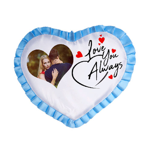 Sublimasyon ve lazer baskıya uygun, kenarı mavi fırfırlı, saten bir kalp yastık kılıfıdır.