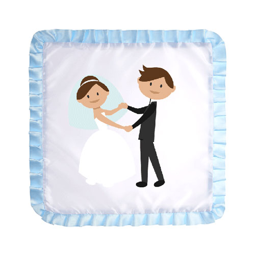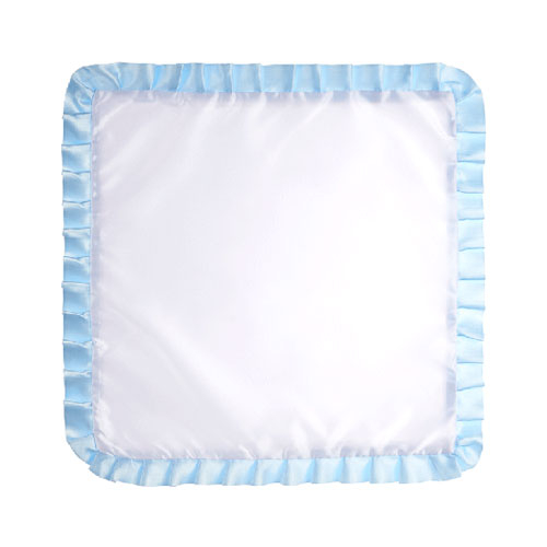 Sublimasyon ve lazer baskıya uygun, kenarı mavi fırfırlı, saten kare bir yastık kılıfıdır.