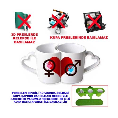 Not: Bu ürün kulp kısmı dar olduğu için 3D transfer baskı makinalarında (ST-3042, ST-420, ST-1520) 3D kupa kelepçesi ile basılamaz. 3D transfer baskı makinalarında basmak için 3D 3'lü kupa baskı aparatı (sitemizdeki ürün kodu: 3YR-10) gereklidir.