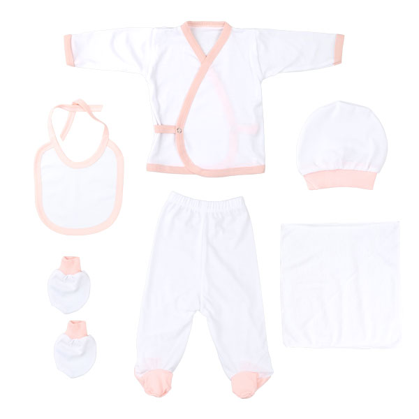 Kruvaze yakalı çıt çıtlı bebek body , Penye pantolon , Şapka , Önlük ,1 çift eldiven , Mendil